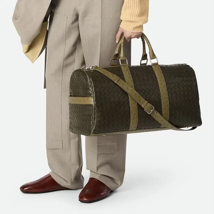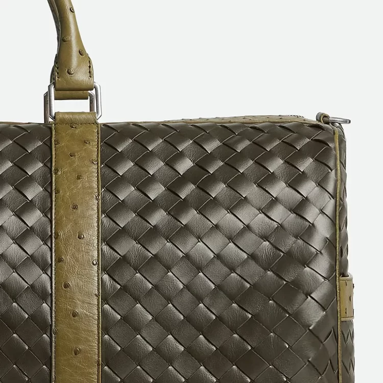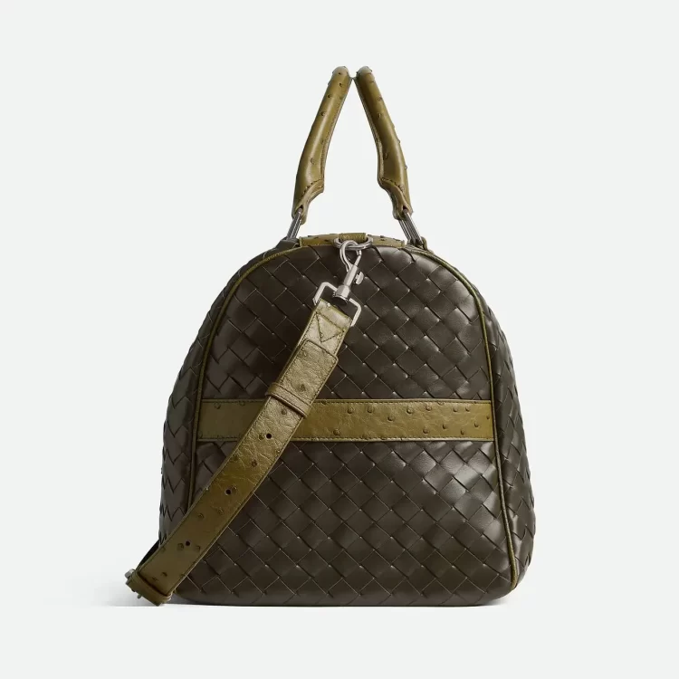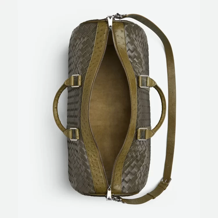 Designed for elevated weekend escapes, this Italian-crafted duffle combines Bottega Veneta’s signature Intrecciato leather with exotic ostrich trims in a distinctive khaki contrast colourway. Its spacious silhouette includes a suede-lined interior with zip and open pockets to keep your essentials organised. A discreet exterior zip pocket offers quick access on the move. The adjustable, detachable strap and top handles provide versatile carry options.